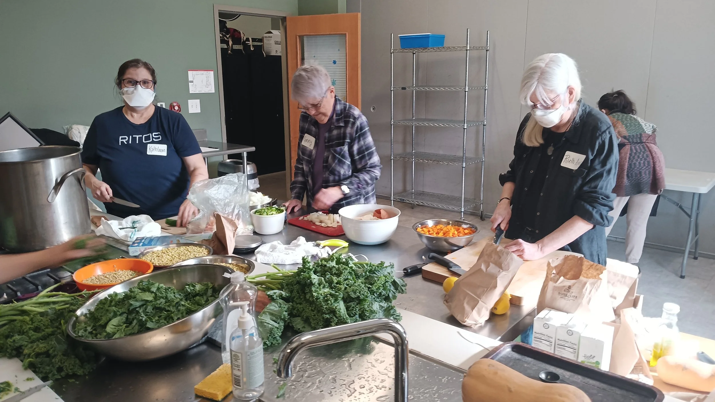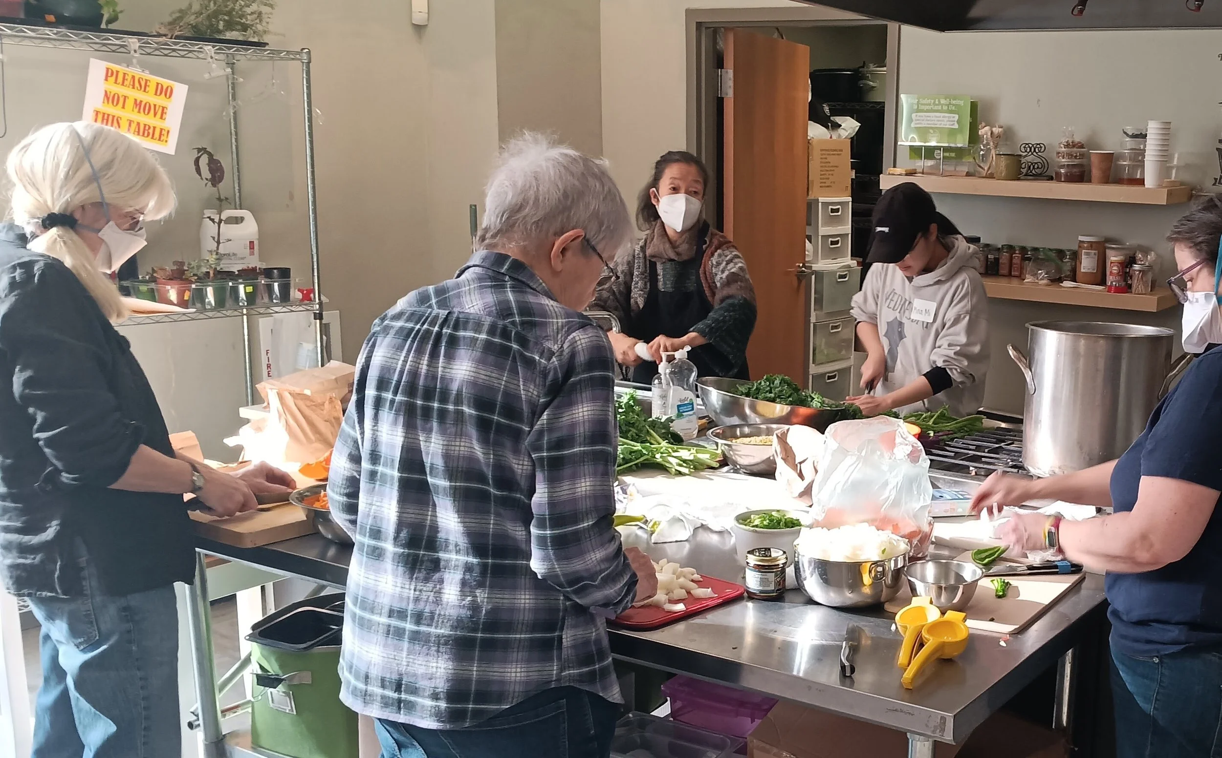 On January 12th, a small but energetic group met up with a mission in the Co-op kitchen: to make a giant pot of soup to share with the community; to provide a space for people to talk about their wishes and concerns around diversity, equity, and inclusion; and to stock the Free Food Fridge in our parking lot with lots of servings of soup.